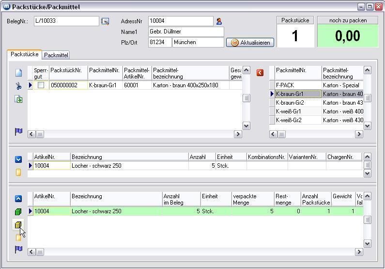 Packmittelzuordnung nach Wahl - Möglichkeit 2: In der Packmitteltabelle (rechts oben) markieren Sie das gewünschte Packmittel (hier im Beispiel "K-braun-Gr1") und klicken dann auf das Symbol
