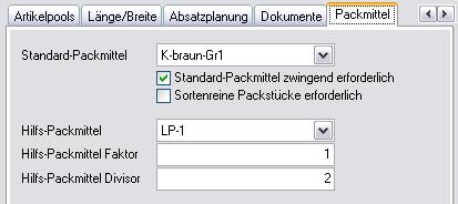 - Falls für den Artikel standardmäßig ein bestimmtes Packmittel vorgesehen ist, wählen Sie dieses im Listen Standard-Packmittel aus.