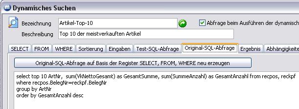 Erstellung der SQL-Abfrage "Artikel-Top-10" (über Menü Dienste/Dynamisches Suchen/Stammdaten):