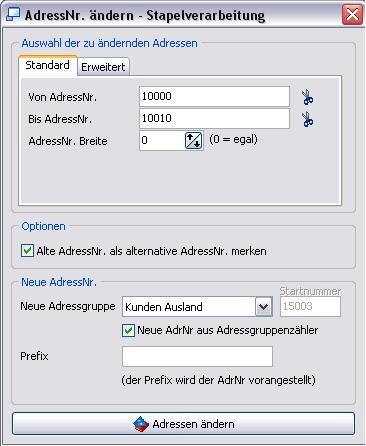Über das Register Standard werden die Adressnummern per Nummernkreiseingrenzung gesucht und geändert. Im Register Erweitert hingegen werden die zu ändernden Adressnummern über SQL-Anweisungen gesucht und geändert. Hier können auch andere (weitere) Anweisungen hinzugefügt werden, solange die Ergebnismenge eine Spalte AdrNr beinhaltet.
