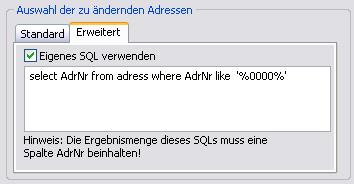 Es müssen gute SQL-Kenntnisse vorhanden sein. Wird ein eigenes SQL verwendet, werden evt. Eingaben bei Von AdressNr./Bis AdresNr. ignoriert. Durch SQL-Anweisungen können Adressnummern mit z.B. bestimmten Zahlen-/Zeichenreihen innerhalb der Adressnummern gesucht und entsprechend der Daten im Bereich Neue AdressNr. geändert werden.