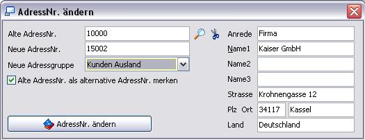 Über das Menü können Sie eine vergebene Adress-Nr. nachträglich ändern lassen. Die Änderung wirkt sich nicht nur in den Adress-Stammdaten, bei zugeordneten kundenspezfischen Preisen usw. sondern auch auf bereits erstellte Belege (es wird hier nur die Adress-Nr. geändert - nicht die Adresse des Beleges) aus.