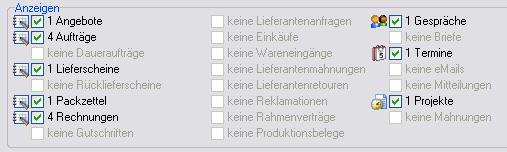 Hier im Beispiel sind folgende Vorgänge zur Adresse zu verzeichnen: Es wurden Angebote, Aufträge, Lieferscheine, Packzettel und Rechnungen geschrieben. Es wurde ein Gespräch geführt und ein Termin vereinbart. Weiterhin wurde ein Projekt für die Adresse angelegt. Weitere Vorgänge gibt es zu dieser Adresse nicht.
