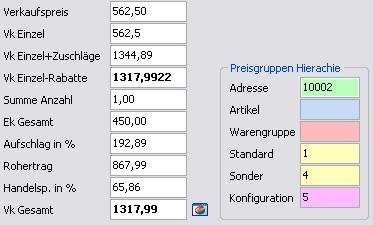 Im rechten Bereich des Formulars Preisanfrage befinden sich die Verkaufsdaten (Preise, Rabatte, ggf. Zuschläge) des Artikels/Kunden. Beispiel 1: Artikel mit Zuschlägen und Rabatt