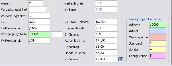 Aus den Daten [Anzahl (hier: 2), Verkaufspreis (hier kundenspezifischer mit 8,88 Euro) und Rabatt (hier Beleggesamtrabatt mit 2%)] berechnen sich die Verkaufsdaten.
