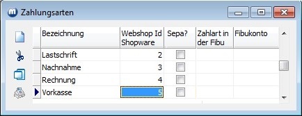 Rufen Sie das metropolis-Menü Finanzen/Parameter/Zahlungsarten und tragen Sie dort in die Tabelle bei der jeweilig passenden Zahlungsart die shopware-Zahlungsart-"ID" in die Spalte Webshop ID Shopware ein.