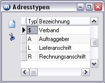 WICHTIG: Damit in den Belegen eine einwandfreie Zuordnung von Anschriften erfolgen kann, müssen bestimmte Adresstypen in vorgegebener Form angelegt werden. So gilt: $ für Verband , A für Auftraggeber, L für Lieferanschrift und R für Rechnungsanschrift - siehe auch Grafik. Andere Adresstypen (Anschriften) können individuell gewählt werden.
