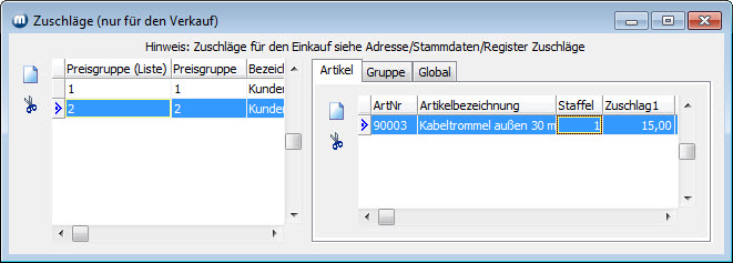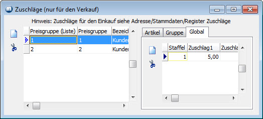Adressunabhängige globale Zuschläge, Gruppenzuschläge und Artikelzuschläge werden über das Menü Artikel/Zuschläge angelegt. Sie müssen in Verbindung mit einer Preisgruppe angelegt werden.