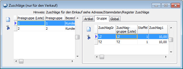 Im Register Gruppe definieren Sie Zuschlagsgruppen und tragen zu jeder Gruppe die Zuschläge ein.