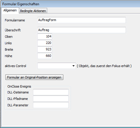 Für das aktuell aufgerufene Formular können Sie die Überschrift, d.h. den Formularnamen, die Position (Felder Oben, Links), die Formulargröße (Felder Breite, Höhe), das Feld für die Cursorposition (aktives Control) beim Formularaufruf bestimmen. Der Formularname kann nicht verändert werden.
