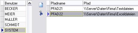 Wenn sich die zugehörigen Programme und Dateien auf einem Server - zentral für alle Benutzer - befinden, legen Sie für den Benutzer "SYSTEM" UNC-Pfade an. Verwenden Sie dann aber nicht die Pfadnamen (PFAD20, PFAD21 usw.), wie sie automatisch vergeben werden, denn es findet keine Prüfung auf Dubletten statt. Vergeben Sie eine andere eindeutige Bezeichnung für den jeweiligen Pfadnamen. Dabei ist zu beachten, dass dieser nicht mehr als 8 Stellen hat und in Großbuchstaben geschrieben wird.