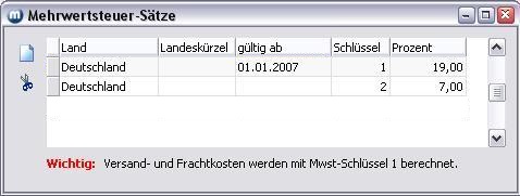 Wird nicht mit Auslands-MwSt.-Sätzen gearbeitet, erfolgen keine weiteren Einträge, d.h. in der Tabelle würden dann nur 2 bzw. 3 Zeilen stehen: Schlüssel 1 = 19%, Schlüssel 2 = 7%.