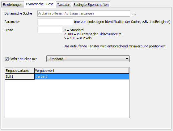 3. Im Feld Dynamische Suche wird über ... die gewünschte Suche ausgewählt. Damit werden auch die Eingabevariablen (welche im Register Eingaben der dynamischen Suche hinterlegt wurden) angezeigt. Jetzt können hierfür Vorgabewerte (hier im Beispiel: #artnr#) eingetragen werden.