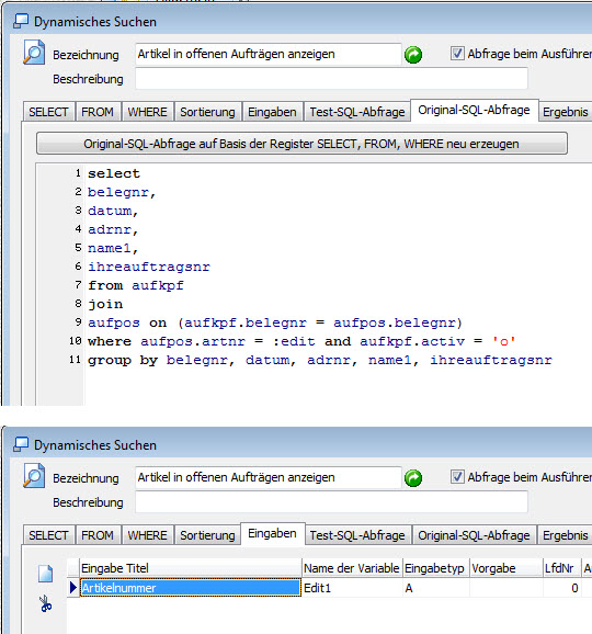 Beispiel: Über einen Button in den Artikelstammdaten soll eine Liste aufgerufen (bzw. gedruckt werden), die den aktuell aufgerufenen Artikel in offenen Aufträgen anzeigt.