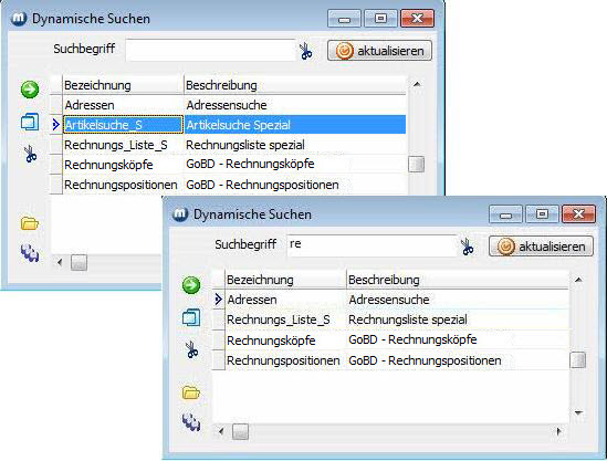 Mit dem Eingeben von Suchbegriffen, kann die Auswahl eingegrenzt werden. Gesucht wird mit der eingegebenen Zeichenfolge in den Feldern Bezeichnung und Beschreibung. Beispiel: Wird in den Suchbegriff "re" eingegeben, werden alle dynamischen Suchen angezeigt, außer der Suche "Artikelsuche_S / Artikelsuche Spezial", denn hier gibt es keine Zeichenfolge "re" in den besagten Feldern. Wird der Suchbegriff um ein "s" erweitert (also "res"), wird nur die Suche "Adressen / Adressensuche" angezeigt. Mit jeder weiteren Buchstabeneingabe wird also die Auswahl verkleinert (vorausgesetzt, die Bezeichnungen bzw. Beschreibungen der einzelnen Suchen unterscheiden sich entsprechend).