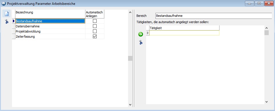 Rufen Sie das Menü Allgemeines/Projektverwaltung/Parameter/Arbeitsbereiche auf und tragen Sie die gewünschten Arbeitsbereiche ein. Jedem Arbeitsbereich können Sie hier oder später in der Projektverwaltung Tätigkeiten zuordnen. Über den Schalter "Automatisch anlegen" können Sie steuern, dass der Arbeitsbereich und die hinterlegte Tätigkeit automatisch bei der Projektneuanlage im Projekt angelegt werden.