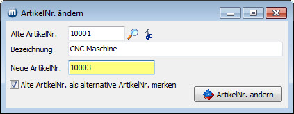 Menü Artikel/Dienste/ArtikelNr. ändern: Geben Sie die Alte ArtikelNr. ein und drücken Sie die RETURN-Taste um auch die Artikelbezeichnung anzeigen zu lassen oder suchen Sie den Artikel über die Lupe. Geben Sie die neue Artikel-Nr. ein und bestimmen Sie, ob die alte Artikelnummer im Register alternative ArtikelNr. der Artikelstammdaten gespeichert werden soll. Klicken Sie dann auf den Button Artikelnr. ändern.