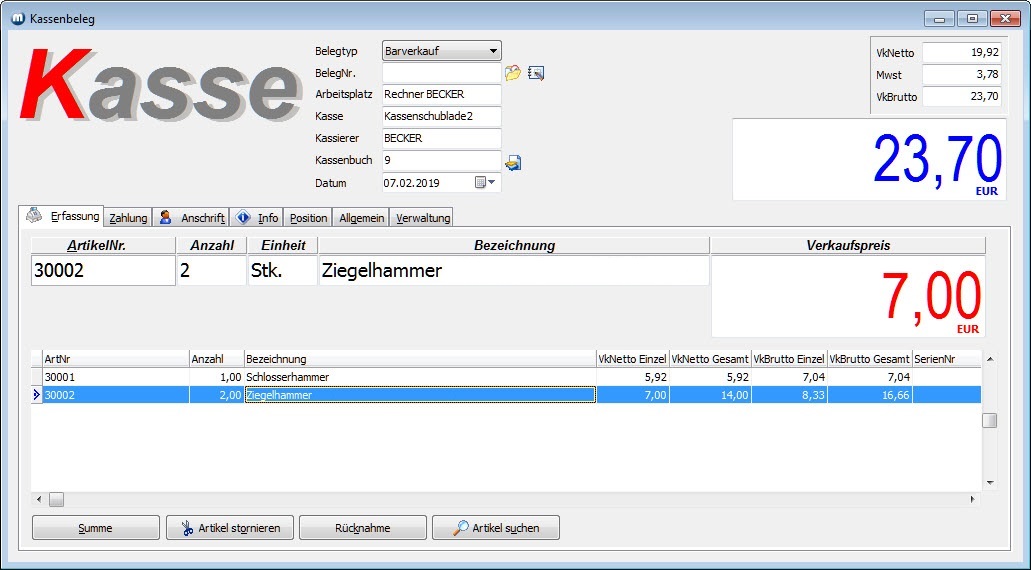 Solange sich ein Artikel noch in der Erfassungszeile befindet, kann er mit der Eingabe "0" im Feld Anzahl wieder entfernt werden.