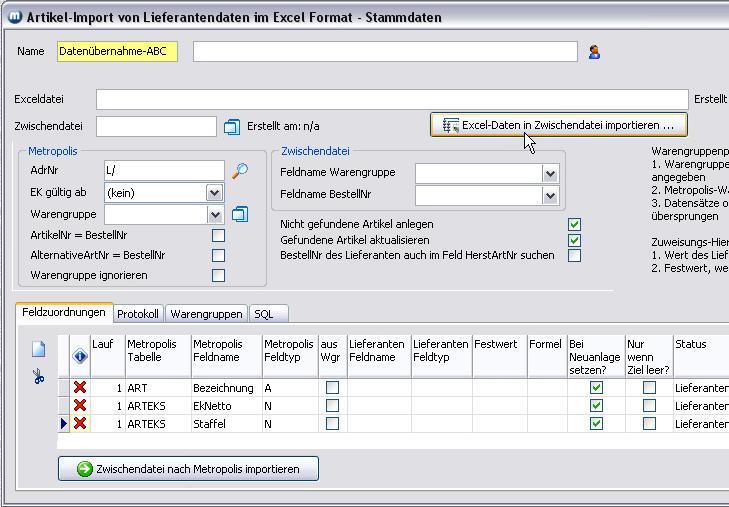 Im Register Feldzuordnungen werden die Felder der Exceldatei des Lieferanten mit den Feldern in metropolis verknüpft. Über den Neueingabe-Button wird ein Formular aufgerufen, in dem man die Metropolis-Dateien (Tabellen: ART, ARTEK, ARTEKS oder ARTSPR) aufrufen und die gewünschten Felder auswählen kann.