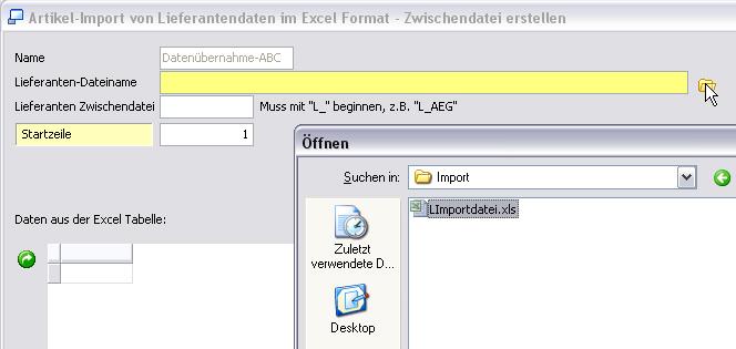 Klicken Sie auf das Öffnen-Symbol rechts neben dem Feld Lieferanen-Dateiname, wird das Windows-Standard-Formular Öffnen angezeigt. Wählen Sie dort die gewünschte Exceldatei aus dem gewählten Verzeichnis aus. Mit dem Klicken auf den Button Öffnen im Formular Öffnen werden die Daten eingelesen.