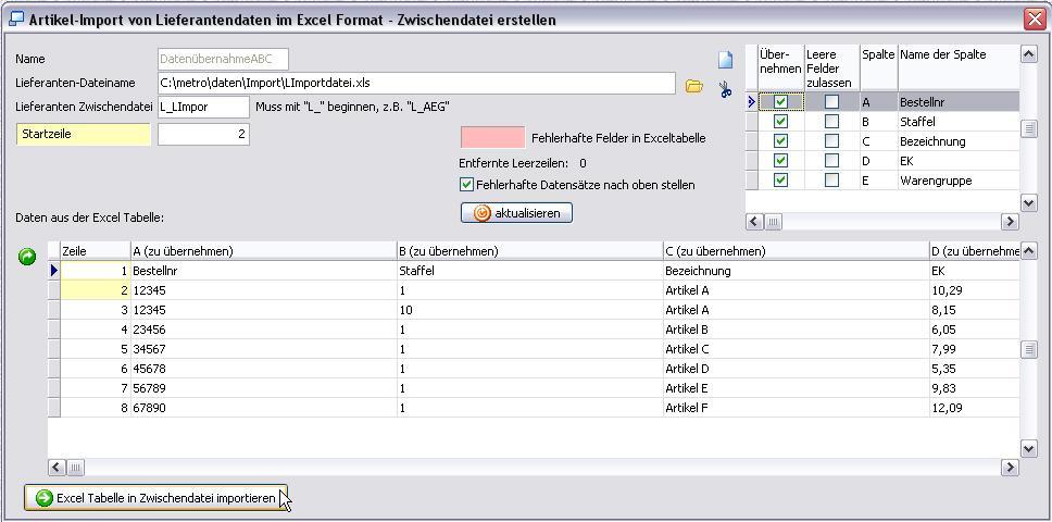 Beispieldatensatz aus Exceldatei: Bestellnr; Staffel; Bezeichnung; EK; Warengruppe; Fremd1; Fremd2