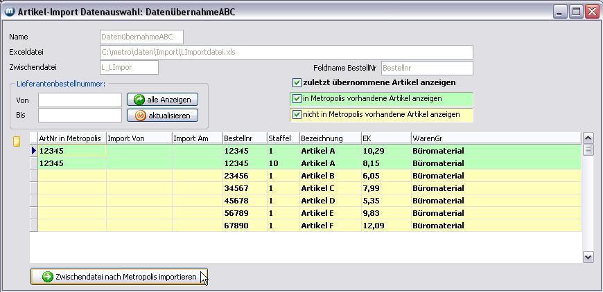 In dem Formular können Sie nun bestimmen, welche Daten ins metropolis importiert werden sollen. Sie können den Importumfang durch Angabe der Lieferantenbestellnummer - Von - Bis bestimmen". Treffen Sie keine Auswahl werden alle angezeigten Artikel importiert. Alle noch nicht in metropolis anhand der Bestellnr. gefundenen Artikel werden gelb angezeigt und neu angelegt. Vorhandene Artikel werden aktualisiert.