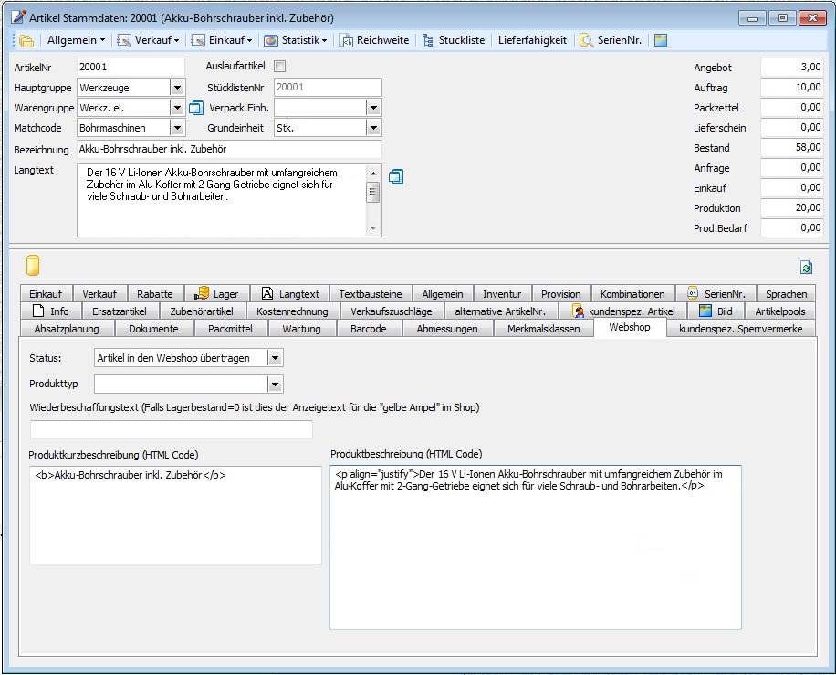 Die Produktkurzbeschreibung (HTML Code) und die Produktbeschreibung (HTML Code) werden als Artikellangtext im Webshop angezeigt. Sie können hier auch nur Text ohne HTML-Tags erfassen. Dadurch haben Sie die Möglichkeit, für Ihren Webshop eine von metropolis abweichende Beschreibung zu hinterlegen. Sind diese Felder nicht gefüllt, werden die Artikelbezeichnung und der Langtext der Artikelstammdaten herangezogen. Die Felder Produkttyp und Wiederbeschaffungstext können ignoriert werden.