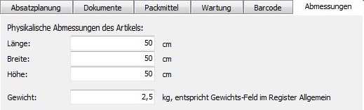 Die Maße und das Gewicht eines Artikels können Sie unter dem Register Abmessungen in den Artikelstammdaten hinterlegen.