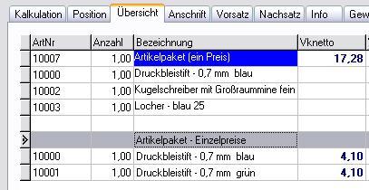 In der Grafik sehen Sie oben einen Artikelpaket mit "Hauptartikel" und einem Preis. Unten wurde eine Textzeile "Artikelpaket - Einzelpreise" eingefügt. Das Artikelpaket selbst besteht aus "Druckbleistift - 07 mm blau" und "Druckbleistift - 07 mm grün" - jeweils mit Einzelpreisen.