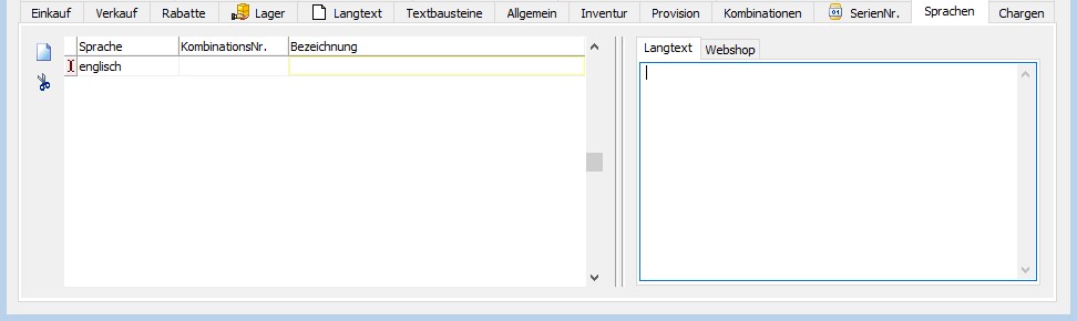 Die Hinterlegung von Übersetzungen erfolgt in den Artikelstammdaten im Register Sprachen. Legen Sie hier einen neuen Eintrag für die benötigte Sprache an. Die hinterlegte Bezeichnung und der Langtext werden dann zu Shopware übertragen, ebenso hinterlegte Texte im Register Langtext.