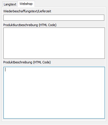 Im Register Webshop können Sie außerdem den Wiederbeschaffungstext/Lieferzeit, Produktkurzbeschreibung und die Produktbeschreibung (jeweils im HTML-Code) hinterlegen. Die Produktbeschreibung wird dann anstelle des Langtextes im Shop angezeigt. Dies ist unter Umständen von den Einstellungen in Shopware und dem genutzten Templates abhängig.