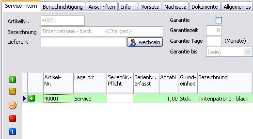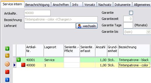 in den Beleg eingefügt. (Der Artikel wurde damit in das Servicelager gebucht.)
