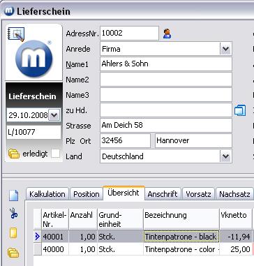 Nachdem die Kundenadresse in den Belegkopf übernommen wurde, wird der Artikel "Tintenpatrone - black" über den Button