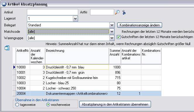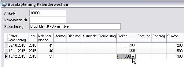 Wenn Sie die Kalenderwochendaten eines bestimmten Artikels einsehen wollen, klicken Sie doppelt auf die entsprechende Zeile.