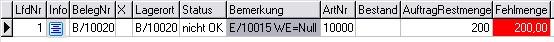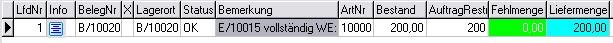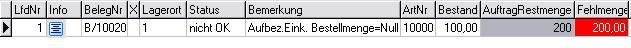 3. Auftrag wurde in den Auftragsbezogenen Einkauf übernommen, es wurde eine Bestellung erzeugt. Nachdem die Ware eingetroffen ist, erfolgte der Wareneingang. Der Lagerort weist entsprechend Bestand auf und die Fehlmenge ist = 0. Eine Komplettlieferung könnte somit erfolgen.