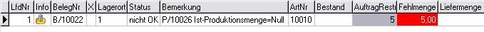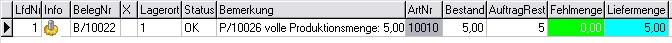 Nachfolgend sehen Sie in der Disposition, Register Rückstände einen Auftrag, der in einen Produktionsbeleg übernommen wurde in verschiedenen Ständen: