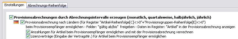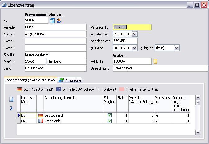 Länderabhängige Artikelprovision, Gültigkeitszeitraum, Vertrags-Nr., Anzahlung