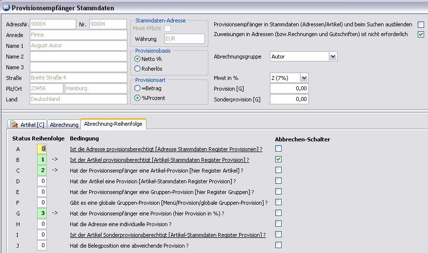 Die Artikel können dem Provisionsempfänger hier im Register Artikel zugewiesen werden. (Die Zuweisung der Provisionsempfängeradresse zu den Artikeln ist auch im Artikelstamm, Register Provision möglich.)