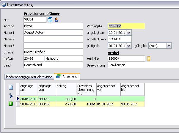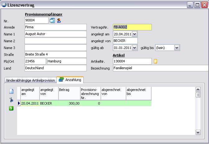 In den Provisionsempfänger Stammdaten werden verbuchte Anzahlungen im Formular Lizenzvertrag angezeigt. Hier im Beispiel für das "Familienspiel".