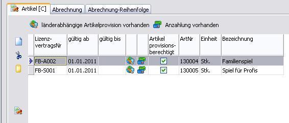 Sind alle Eintragungen durchgeführt worden, werden die Daten in der Tabelle im Register Artikel angezeigt. Die Zeilen werden mit den entsprechenden Symbolen (länderabhängige Artikelprovision und/oder Anzahlungen vorhanden) gekennzeichnet.