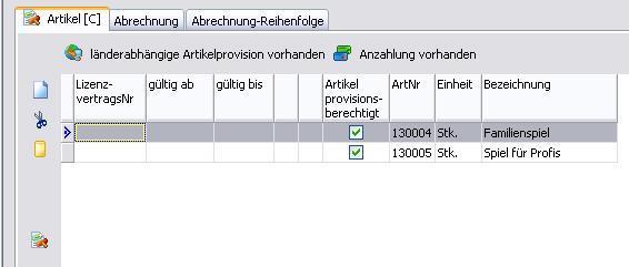 Um die länderabhängigen Artikelprovisionen und die Anzahlungen einzutragen, klicken Sie auf die entsprechende Artikelzeile und dann auf den Button