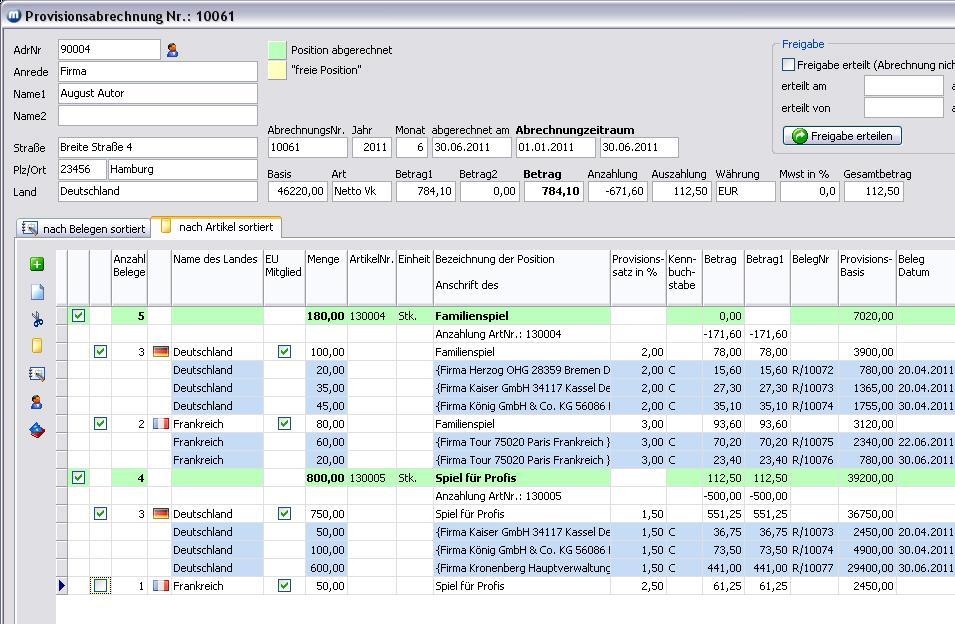 Die Provisionssätze sind entsprechend der länderabhängigen Artikelprovisionen berechnet worden und die Anzahlungen wurden (je Spiel - einzeln) berücksichtigt.