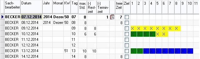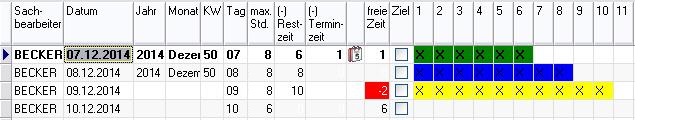 Die nachfolgende Grafik zeigt in der 1 Zeile eine Projektauslastungszeit für BECKER von 6 Std. zuzüglich einer Stunde, die im Terminkalender eingetragen wurde. Für Dienstag ergibt sich also eine 1 Std., die noch nicht verplant ist. Die zweite Zeile zeigt eine Komplettauslastung für das Projekt J/10012. In der dritten Zeile sehen Sie eine Überbelegung, denn die freie Zeit weist einen Minuswert von 2 auf. BECKER hat 8 Std. zur Verfügung, die geplante Zeit (Spalte Restzeit) beträgt 10 Std.