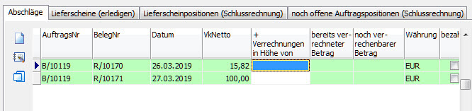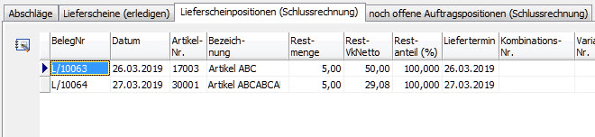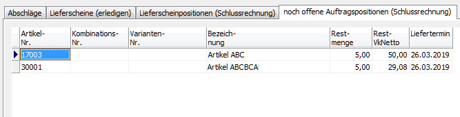 Sind bereits Auftragspositionen zu einem Lieferschein übernommen worden, kann eine Schlussrechnung nur für die gelieferten Positionen über das Register noch offene Auftragspositionen (Schlussrechnung) erzeugt werden.