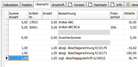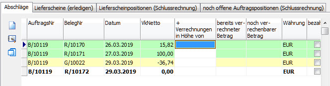 Abschlagrechnungen (gesamt: 115,82) , Gutschrift (36,74), Auftragsbeleg (ursprünglich: 158,16 - jetzt erledigt und auf 0.00)