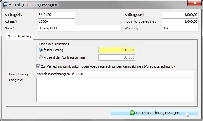 4. Um aus der Abschlagsrechnung eine Vorschussrechnung zu erzeugen, muss das Kontrollkästchen Zur Verrechnung mit zukünftigen Abschlagsrechnungen kennzeichnen (Vorschussrechnung) aktiviert sein. Alle nachfolgenden Abschlagsrechnungen, die nicht als "Vorschussrechnung" gekennzeichnet sind, können mit einer vorhergehenden Vorschussrechnung verrechnet werden.