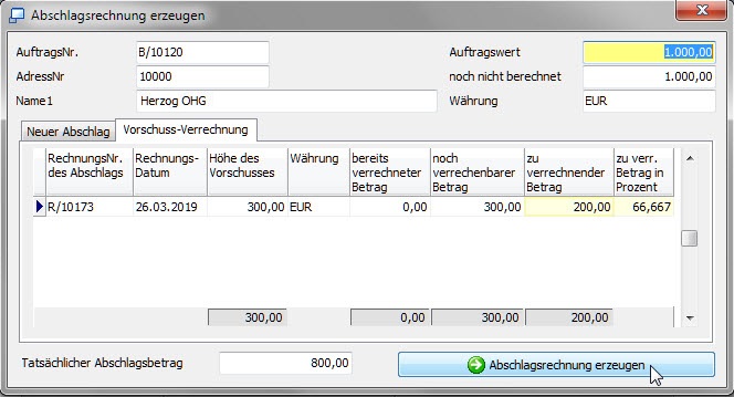 Neue Abschlagsrechnung mit Vorschussrechnung verrechnen