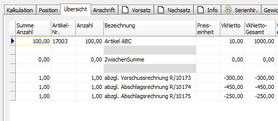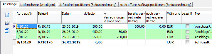 Eine komplette Bearbeitung (mit Vorschussrechnung, über Abschlagsrechnungen mit Verrechnung und Schlussrechung) könnte dann folgendermaßen aussehen.