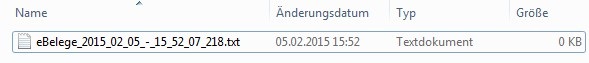 Die Datei wird mit dem Namen (Beispiel: eBelege_2015_02_05_-_15_52_07_218) angelegt. Beispiel einer erzeugten Datei für den Import nach metropolis.
