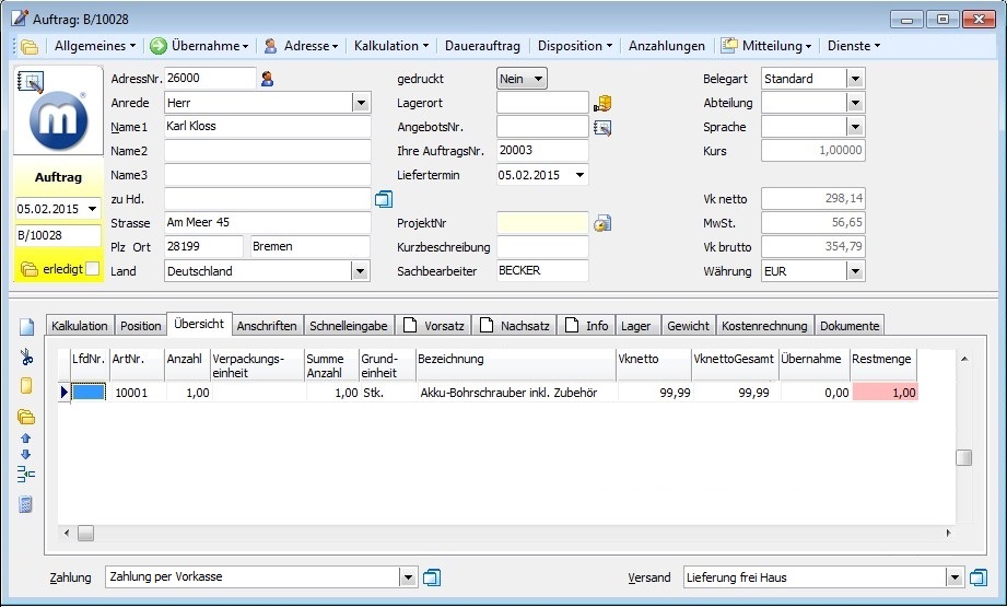 Wenn Sie den metropolis-Belegimport ausführen, werden die Belege als Aufträge importiert und können weiterbearbeitet werden. Beispiel eines erzeugten Auftrages: